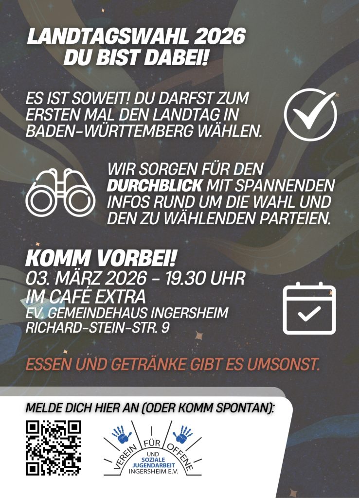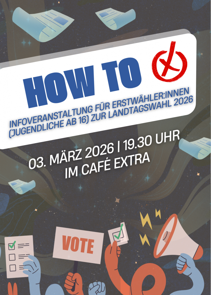 Wir laden alle Erstwähler (Jugendliche ab 16 Jahren) am 03.03.2026 um 19.30 Uhr ins Café EXTRA ein. Wir sorgen Für den DURCHBLICK zur Landtagswahl mit spannenden Infos rund um die Wahl und den zu wählenden Parteien. Essen und Getränke gibt es umsonst. Hier geht’s zur Anmeldung!